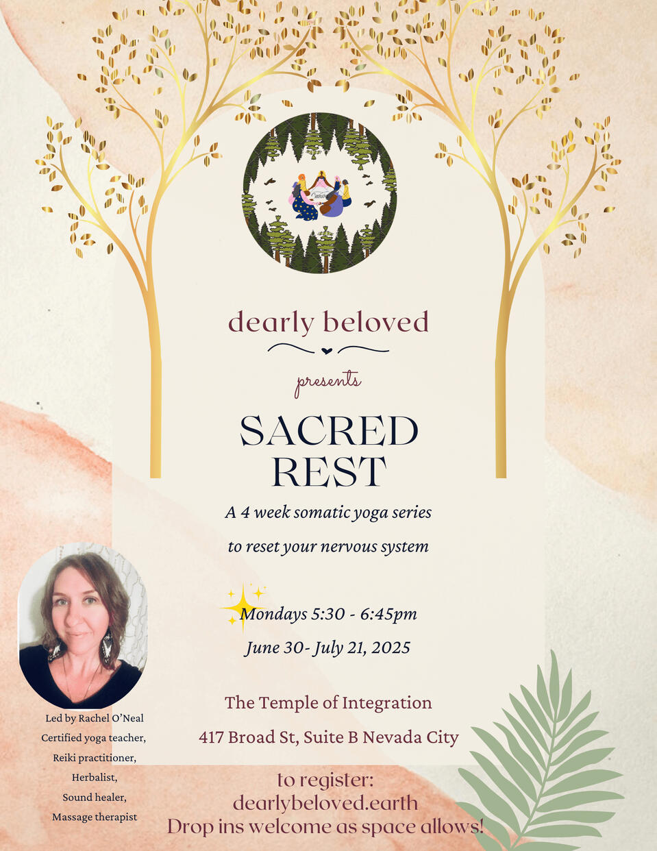 This is a space for slowing down, returning to your body, and reuniting with your self and the greater spirit that holds us.Through attunement with nature, mindful movement, and inner stillness, we find our way home to ourselves, the wisdom we already carry and the love that supports us.“Dearly Beloved” is more than a name. It’s also a prayer- to the earth, to our ancestors and guides, to the knowing held in our bodies, and to the sacred self within.